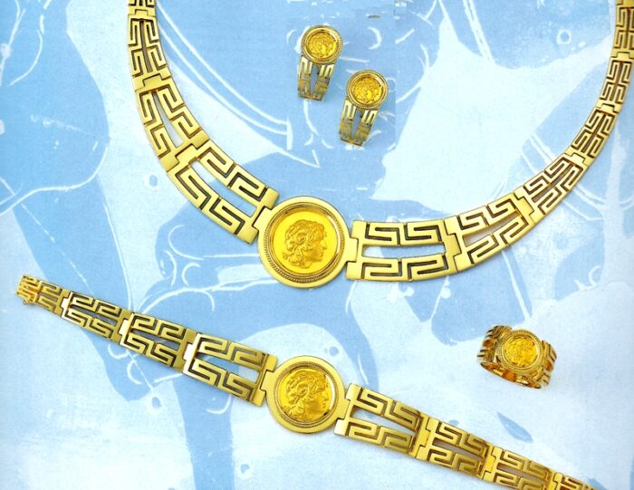 Beautiful Jewelry set consisting of a necklace, bracelet, earrings and a ring with Alexander the Great, the Greek Macedonian king that conquered half the known world in 330 BC. (find out more about Alexander the Great…)