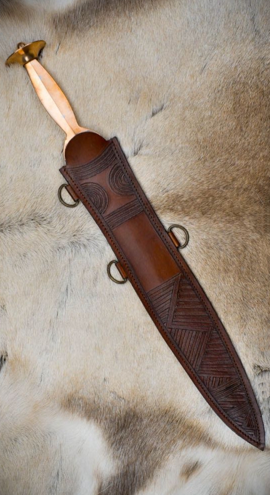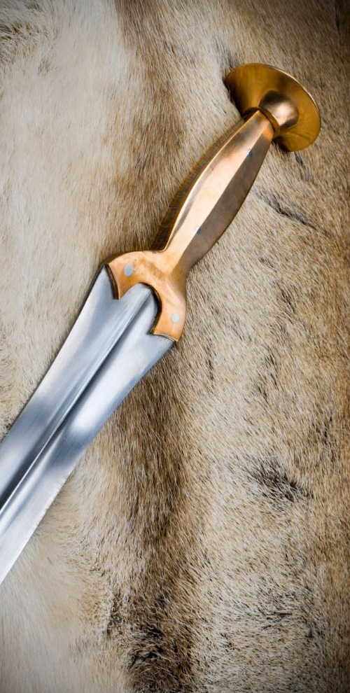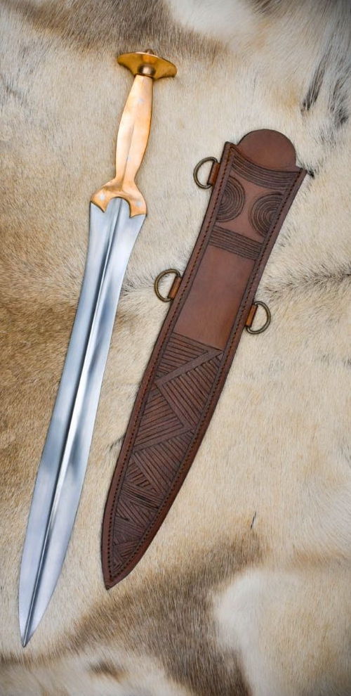 The sword used by the hoplites (=soldiers), who formed the undefeated main phalanx of the Spartan army. The sword was an essential part of a Spartan warrior’s armament, complementing the longer spear (dory) that was the primary weapon used in battle. The xiphos was characterized by its leaf-shaped blade, which widened at the center before tapering to a sharp point. This design allowed for effective slashing and thrusting, making it versatile in close combat situations.