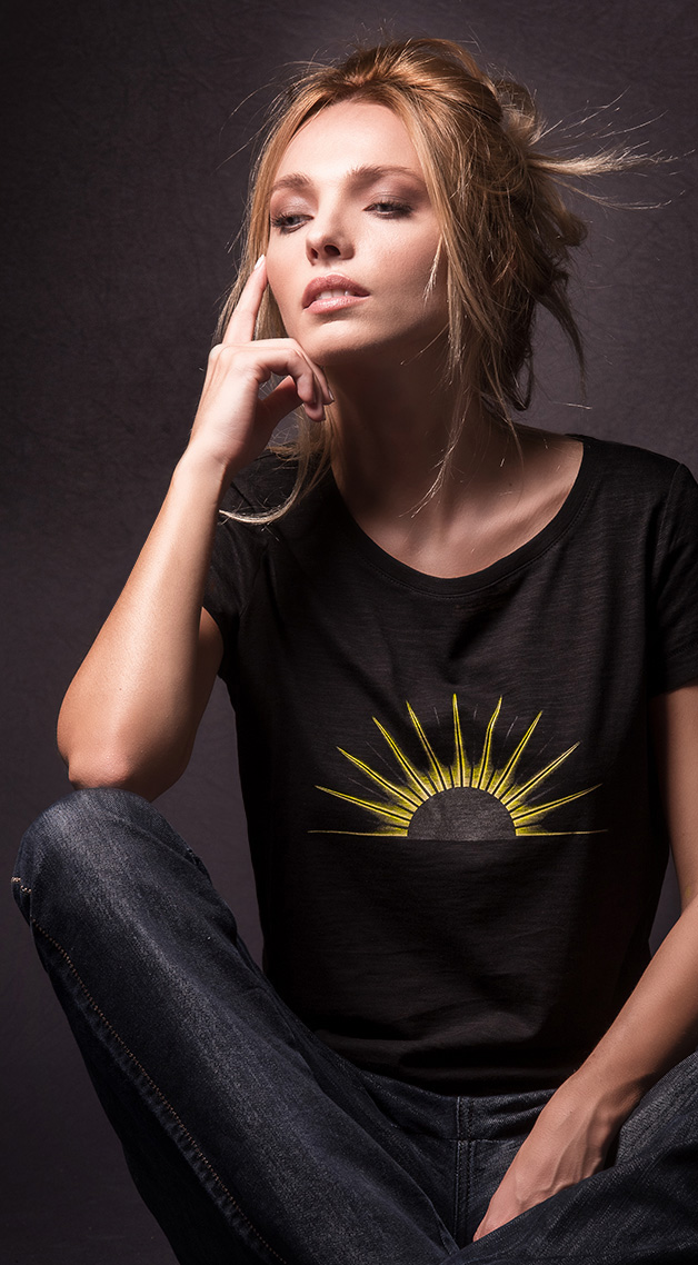 Stylish women’s t-shirt depicting a rising sun the symbol of Apollo, the god of Light, ideal for an evening out in town.