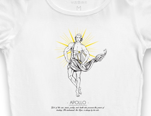 Stylish women’s t-shirt depicting Apollo the god of Light and Music, ideal for a morning stroll on the beach.