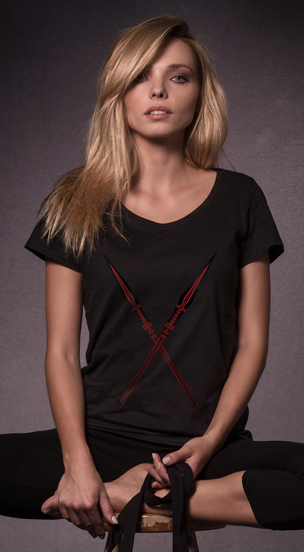 Stylish women’s t-shirt depicting two crossed spears the symbol of Ares, the god of War, ideal for an evening out in town.