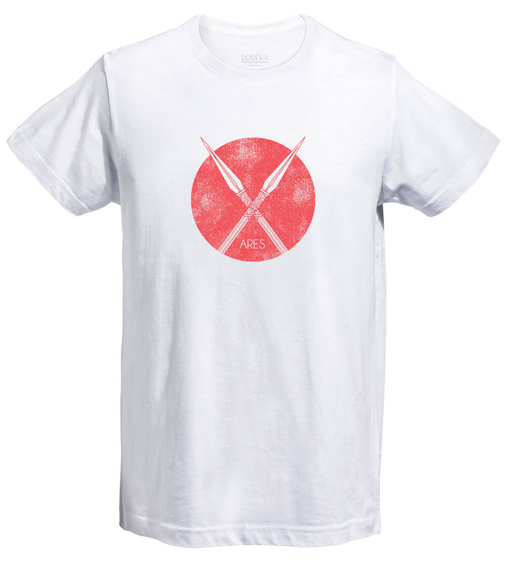 Stylish men’s t-shirt depicting two crossed spears the symbol of Ares, the god of War, ideal for summer activities.