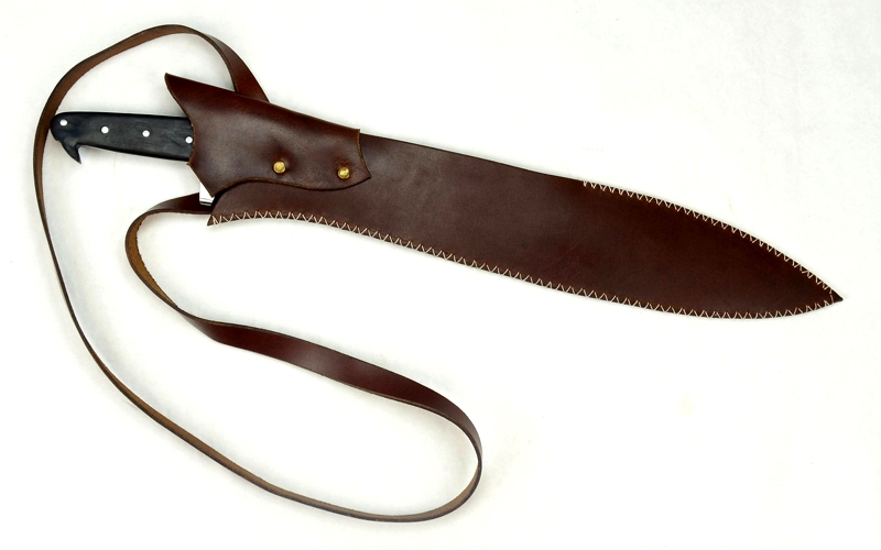 This Athenian Kopis, used by the cavalry of Athens after the 5th century BC, has a blade of high carbon steel. The hilt is crafted from horn that is solidly riveted to the thick, full tang of the blade to construct the grip. The sheath and integrated shoulder baldric are crafted from stitched and riveted leather.