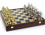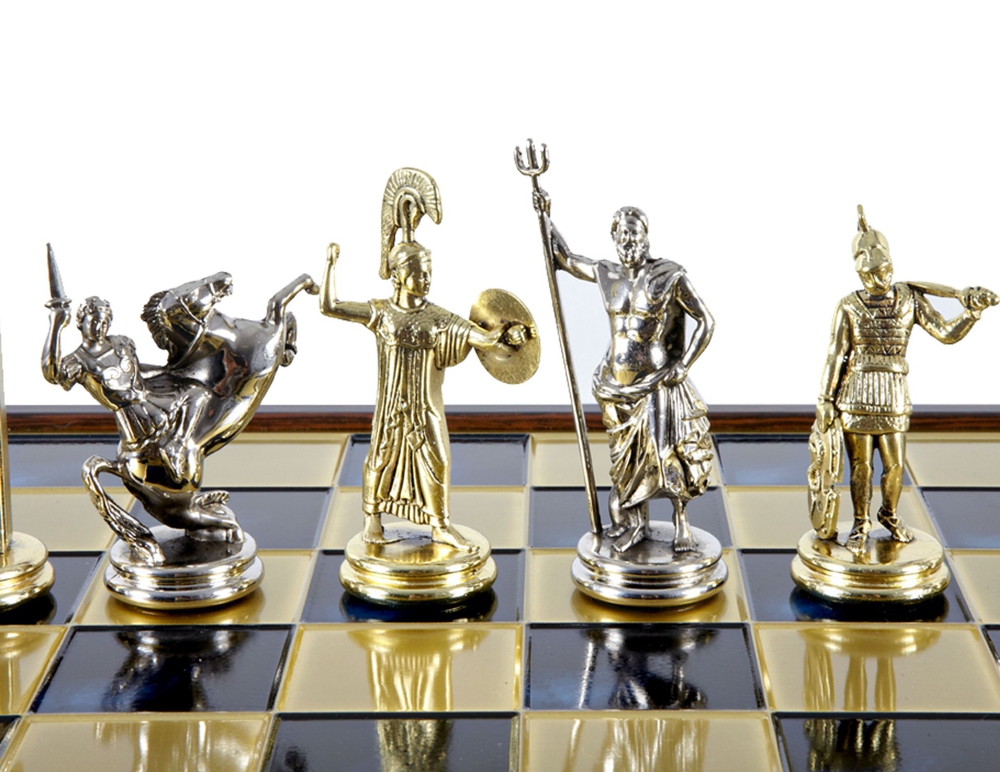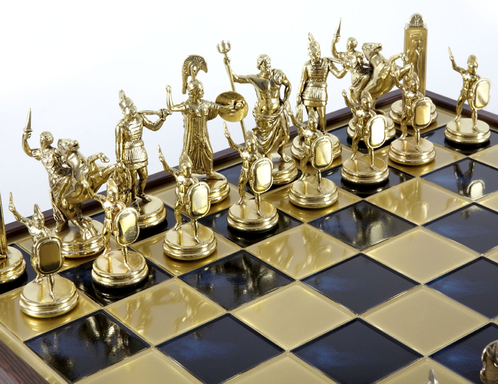 Our chessmen are made on a basis of an original zinc alloy, they are then gold or silver plated and finally varnished by hand. The chess boards are made of zinc alloy and painted by hand. All the pieces are unbreakable and have a life time guarantee.