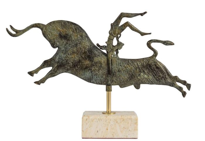 Bronze sculpture depicting the Bull-leaping of the famous Minoan fresco (see https://www.hellenic-art.com/product/bull-leaping-size-1/)