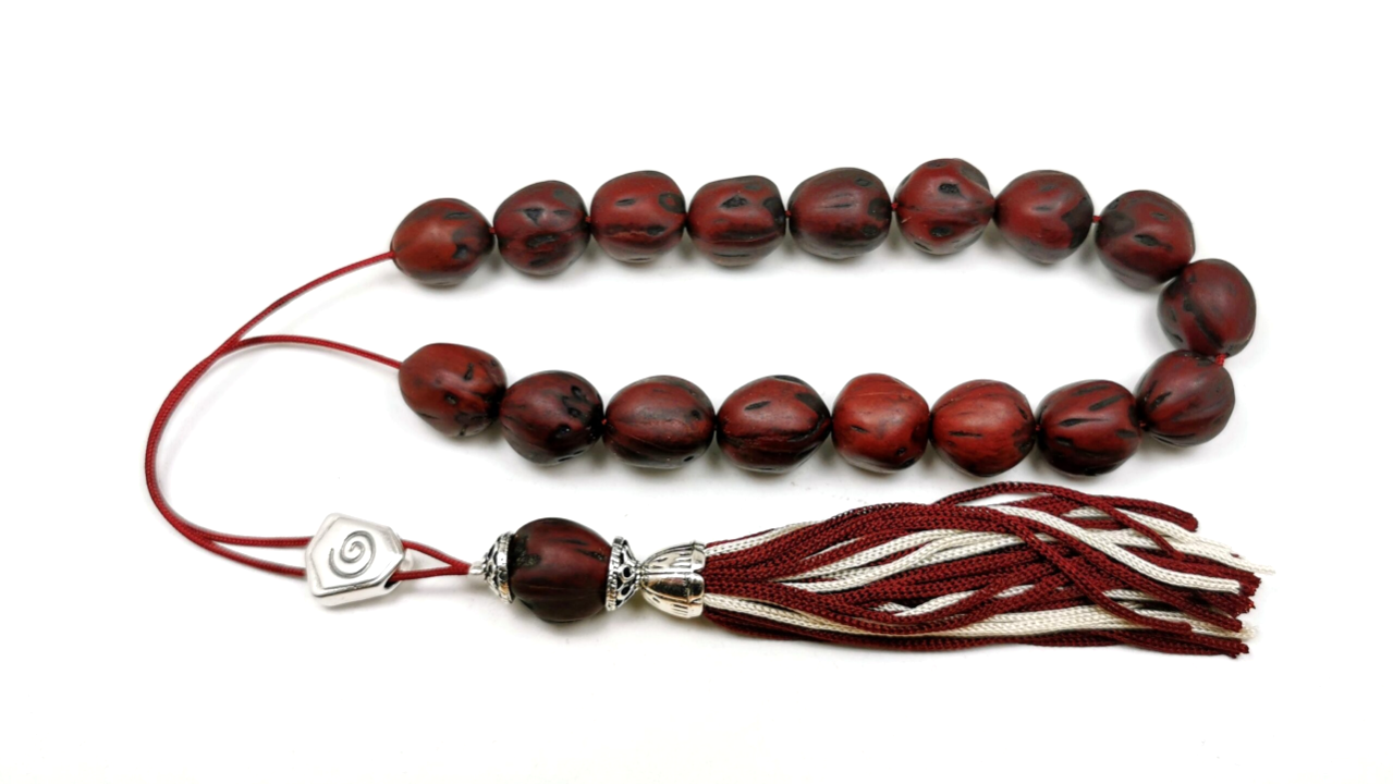 This is a beautifully handmade scented komboloi with 18 irregularly shaped beads of genuine aromatic nutmeg.