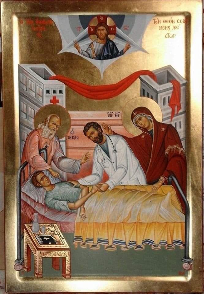 The icon shows Jesus Christ, His Mother the Virgin Mary and St. Luke the Physician, guiding a Christian physician as he tends to the sick.