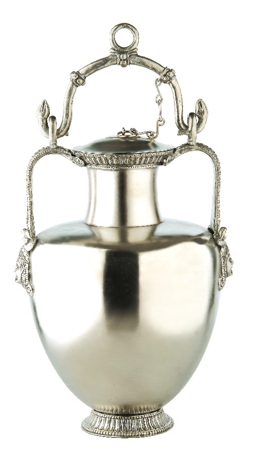 The vessel follows the typical shape of the amphora: A narrow neck and two handles on the sides for lifting and pouring. The body of the amphora is wider and rounder, tapering to a narrow base. The use of copper for such an object indicates wealth and status, as copper was more costly than clay.