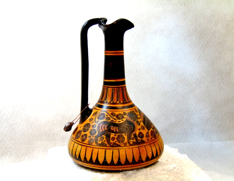 This oinochoe features an oriental influence, reflecting Corinth’s
