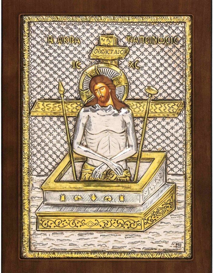 A beautiful silver & gold Greek Orthodox icon of the “Extreme Humility” of Jesus Christ.