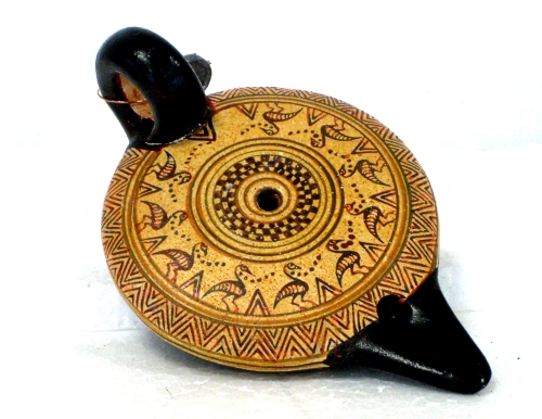 This oil lamp features a complex design with geometric motives and