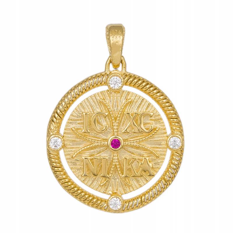 A beautiful Constantinato coin pendant with a red zirgon stone.