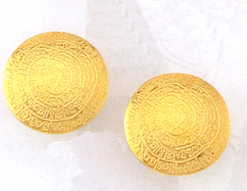Clip earrings of the Phaistos disk, one of the most famous mysteries of archaeology. It was discovered in Crete and is dated to 1500 BC.