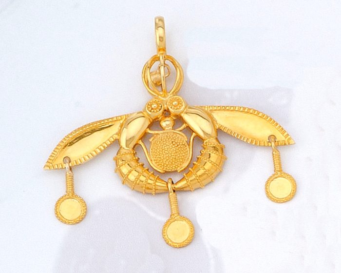 This jewelry piece is an evidence of the artist’s mastery in the process of faience or granulation, the technique of soldering tiny pieces of metal, on the surface of the cast jewel.