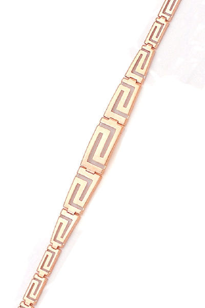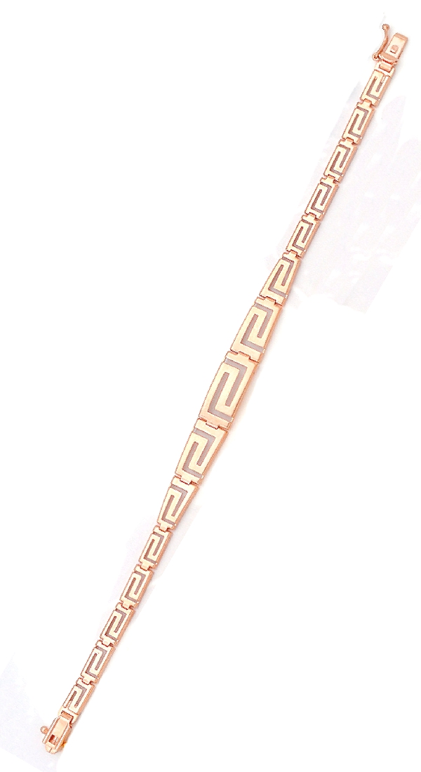 The bracelet is designed to be slightly chunky yet sleek, with a comfortable, flat profile that allows it to sit elegantly on the wrist. Each Greek key segment is finely polished, catching the light with a subtle sheen and adding dimension to the intricate pattern.