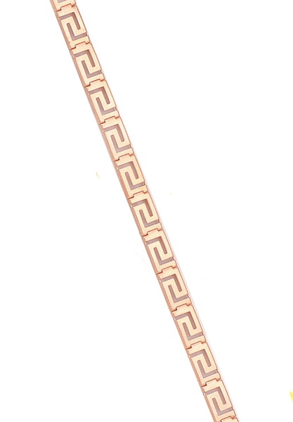 The bracelet is designed to be slightly chunky yet sleek, with a comfortable, flat profile that allows it to sit elegantly on the wrist. Each Greek key segment is finely polished, catching the light with a subtle sheen and adding dimension to the intricate pattern.