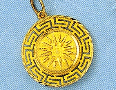 The pendant bears the Sun of Vergina, the emblem of the mighty Macedonian Empire which flourished in the 4th century BC.