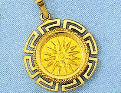 The pendant bears the Sun of Vergina, the emblem of the mighty Macedonian Empire which flourished in the 4th century BC.