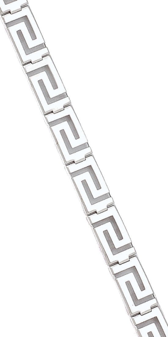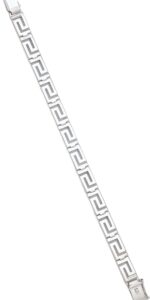 A beautifully crafted bracelet in lustrous sterling silver, designed with the timeless Greek key pattern as its main feature. Each segment of the bracelet showcases the iconic interlocking lines of the Greek key, creating a rhythmic, geometric flow that symbolizes eternity and interconnectedness. The pattern wraps seamlessly around the wrist, forming a continuous band of intricate detail.
