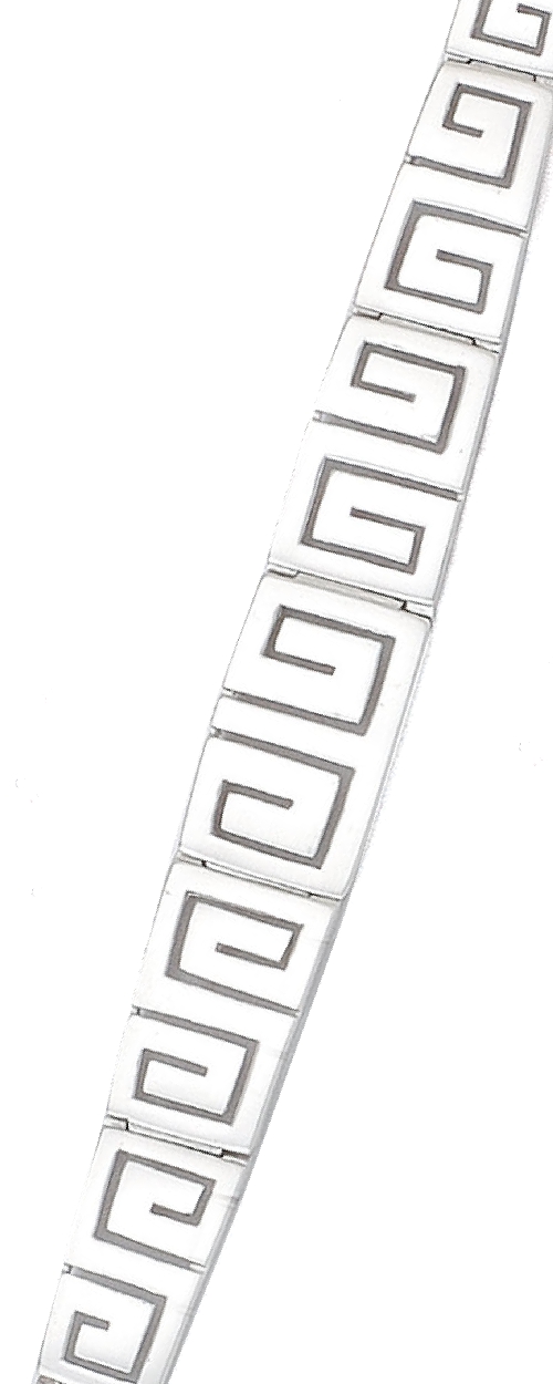 A beautifully crafted bracelet in lustrous sterling silver, designed with the timeless Greek key pattern as its main feature. Each segment of the bracelet showcases the iconic interlocking lines of the Greek key, creating a rhythmic, geometric flow that symbolizes eternity and interconnectedness. The pattern wraps seamlessly around the wrist, forming a continuous band of intricate detail.