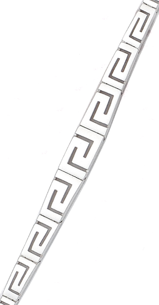 A beautifully crafted bracelet in lustrous sterling silver, designed with the timeless Greek key pattern as its main feature. Each segment of the bracelet showcases the iconic interlocking lines of the Greek key, creating a rhythmic, geometric flow that symbolizes eternity and interconnectedness. The pattern wraps seamlessly around the wrist, forming a continuous band of intricate detail.