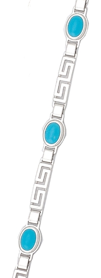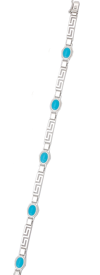 A beautifully crafted bracelet in lustrous sterling silver, designed with the timeless Greek key pattern as its main feature interspersed with turquoise stones. Each segment of the bracelet showcases the iconic interlocking lines of the Greek key, creating a rhythmic, geometric flow that symbolizes eternity and interconnectedness. The pattern wraps seamlessly around the wrist, forming a continuous band of intricate detail.
