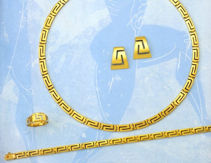 Beautiful Jewelry set consisting of a necklace, bracelet, earrings and a ring in the Greek key pattern, the symbol of eternal life, eternal love and eternal friendship.
