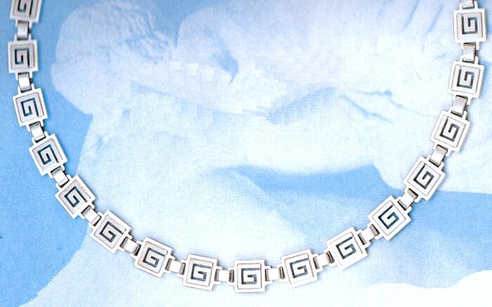 The links of the necklace are designed to lie flat, enhancing both comfort and the way it catches the light. The Greek key segments are interspersed with tiny, subtle silver connectors that give the piece a delicate fluidity, allowing it to drape elegantly around the neck. The clasp, a secure box clasp, is skillfully integrated, maintaining the uninterrupted flow of the pattern.