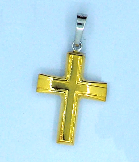 A striking gold plated silver Greek Orthodox cross pendant with a modern yet intricate design. It features a bold, symmetrical layout with detailed engraving along the arms of the cross. The engraved border creates a patterned effect, giving the cross a textured, ornate appearance while maintaining its simplicity.