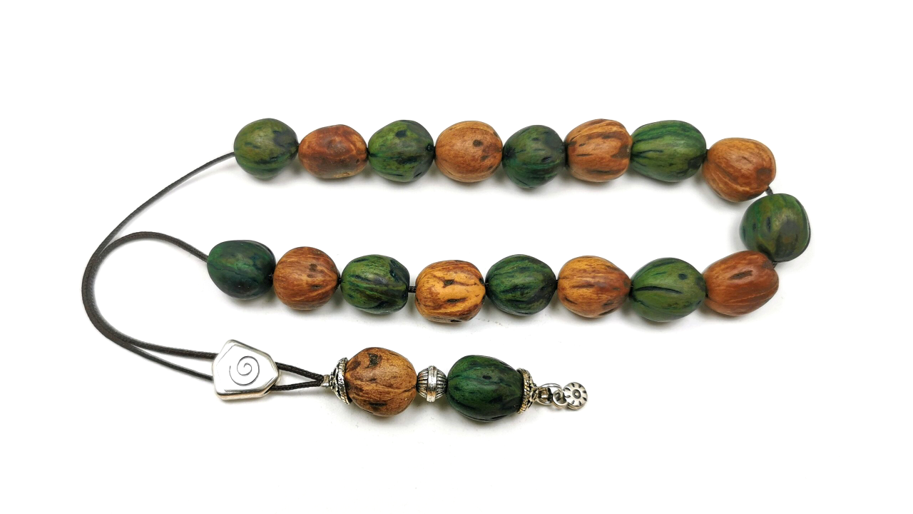 This is a beautifully handmade scented komboloi with 18 irregularly shaped beads of genuine aromatic nutmeg.