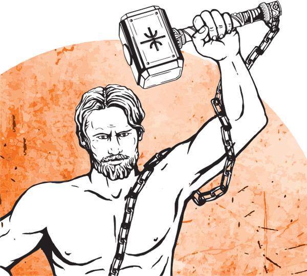 Stylish men’s t-shirt depicting Hephaestus, the god of Fire, ideal for summer activities.