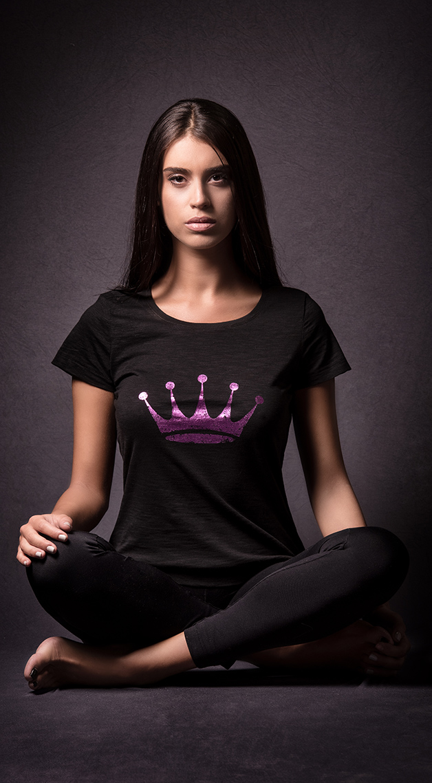 Stylish women’s t-shirt depicting a crown the symbol of Hera, the Queen goddess, ideal for an evening out in town.