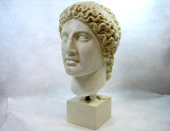 Hera was the queen of the Olympian deities. She is a daughter of Cronus and Rhea, and wife and sister of Zeus. Hera was mainly worshipped as a goddess of marriage and birth. It is said that each year Hera’s virginity returns by bathing in the well Canathus. The children of Hera and Zeus are the smith god Hephaestus, the goddess of youth Hebe, and the god of war Ares.