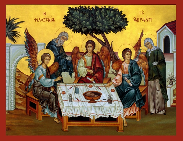 The original icon was created by Russian painter Andrei Rublev in the 15th century. It depicts the Holy Trinity in the form of the three angels who visited Abraham at the oak of Mamre (Genesis 18,1-15), as well as Abraham and Sarah serving them.