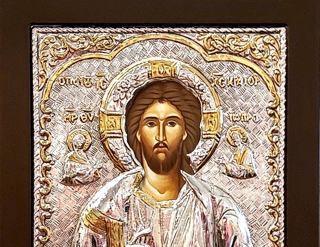 An exquisite silver & gold Greek Orthodox icon of Jesus Christ with Open Book.