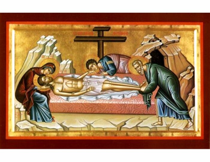 A beautiful Greek Orthodox icon of the Lamentation and Burial of Christ, handmade & hand painted by an expert Greek hagiographer.