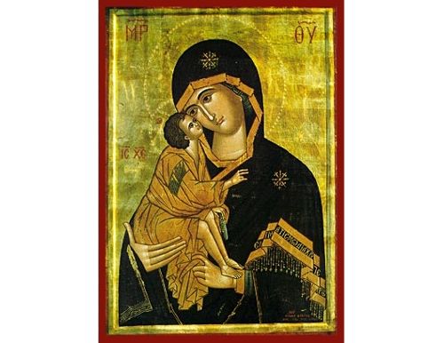A beautiful Greek Orthodox icon of Madonna Donskaja handmade & hand painted by an expert Greek hagiographer. The original icon was painted at the end of the 14th century by the famous painter Theophanes the Greek. According to legend this sacred image of the Don Cossacks was brought in during the fighting on the battlefield of Koelikovo in 1380 against the Tartars, which is said to have led to the victory of the Grand Duke Dimitri.