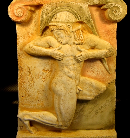 Elaborate marble plaque bearing the representation of a Marathon running hoplite (Hoplitodromos). It was found in Athens and probably formed part of a funerary monument.