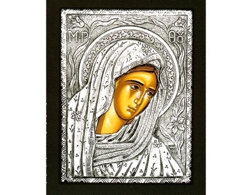 An exquisite silver Greek Orthodox icon of Virgin Mary in mourning.