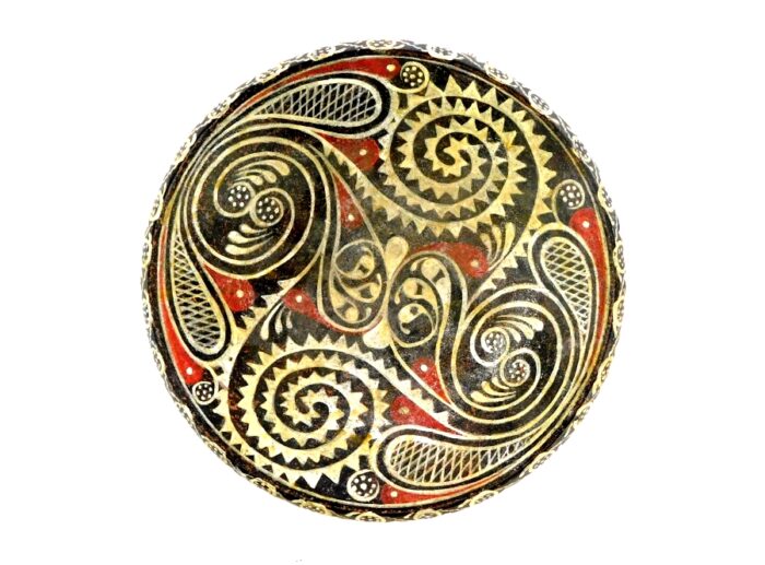 Exact museum reproduction of a fine ancient Greek Minoan fruit plate in the Kamares style.