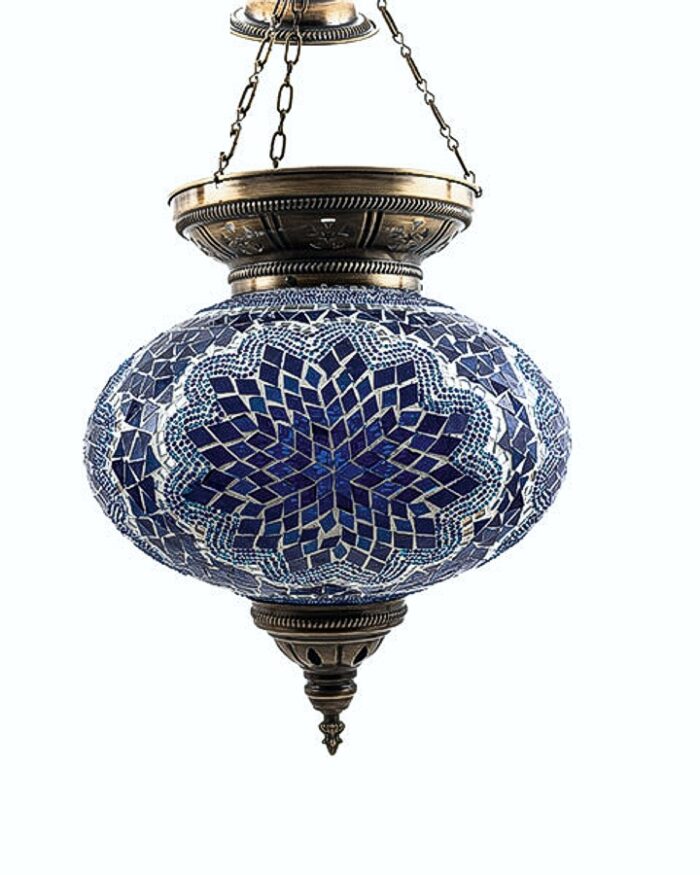 A beautiful handmade mosaic hanging lamp fitted with an electric cable, which hangs from the ceiling or a wall with a long chain.
