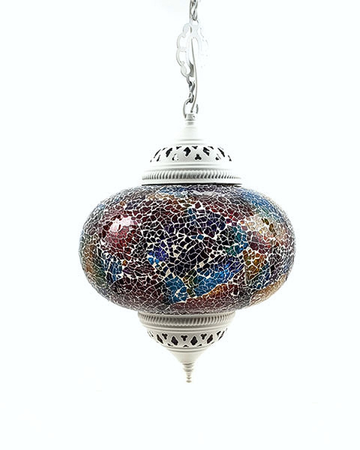 A beautiful handmade mosaic hanging lamp fitted with an electric cable, which hangs from the ceiling or a wall with a long chain.