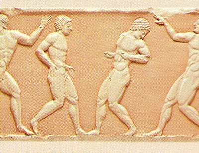 Elaborate reproduction of an ancient Greek fresco relief which was part of the base of a Kouros statue. It depicts a group of young athletes playing some kind of a ball game in ancient Olympia. They are divided in two teams of three members each. The last athlete on the left is holding the ball ready to throw it to the opponent team.