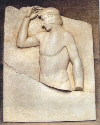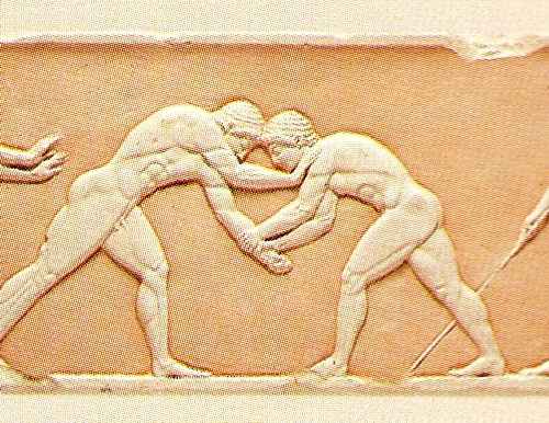 Elaborate reproduction of an ancient Greek fresco relief which was part of the base of a Kouros statue. It depicts two men wrestling during the Olympic games in Olympia and two other men behind them watching them (probably their trainers or referee).