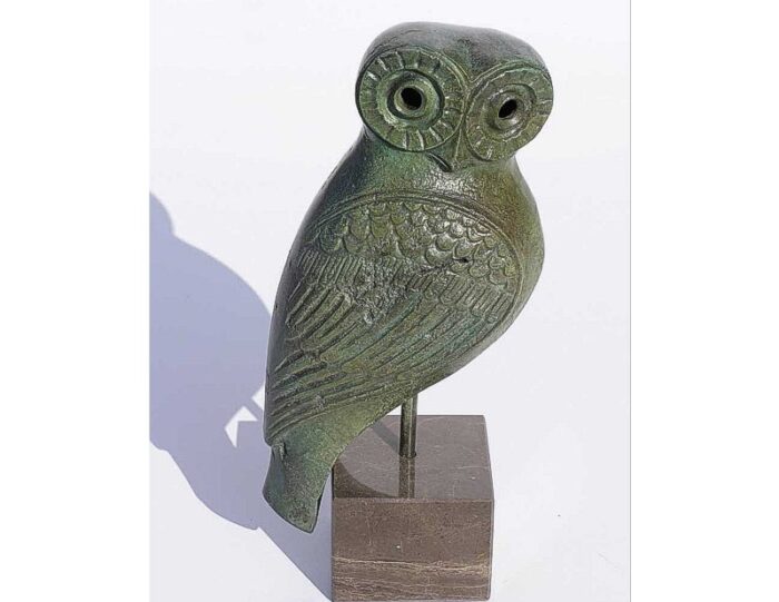 An owl (Athene noctua) traditionally represents or accompanies Athena, the virgin goddess of wisdom, The owl became thus the symbol of the city of Athens, whose patron god was Athena. The owl has been used henceforth as a symbol of knowledge, wisdom, perspicacity and erudition throughout the Western world.