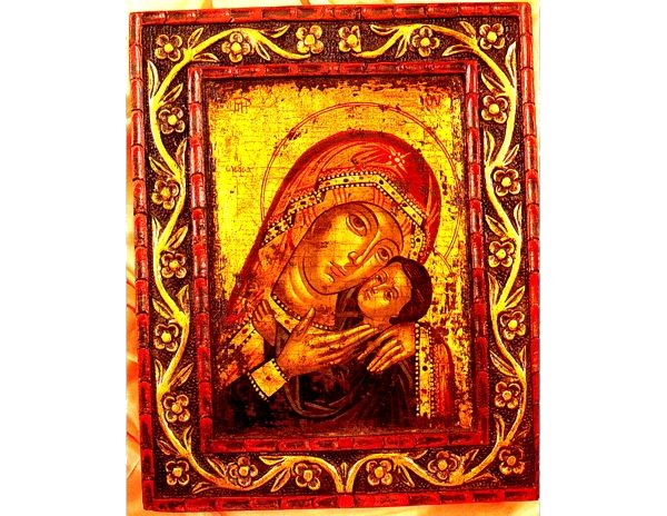 This is an exact reproduction of the antique Byzantine icon of Panaghia Eleousa, preserved in one of the Monasteries of Mt. Athos in Northern Greece.Virgin Mary is shown with the infant Jesus Christ nestled against her cheek. In the Western church the icon is often known as the Virgin of Tenderness.
