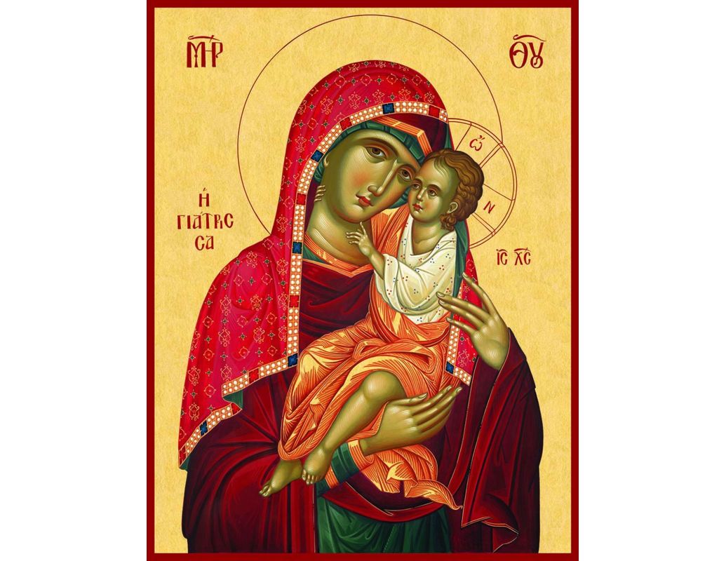 A beautiful Greek Orthodox icon of Panaghia Giatrissa, handmade & hand painted by an expert Greek hagiographer.