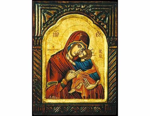 The icon depicts the Virgin Mary caressing her son, so that they appear to be kissing. Virgin Mary appears sad, seemingly contemplating his coming Passion. The representation from the Cretan School of the 17th Century shows very pronounced characteristics of the Virgin Mother.
