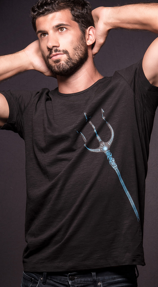 Stylish men’s t-shirt depicting a trident the symbol of Poseidon, the god of the Sea, ideal for an evening out in town.