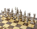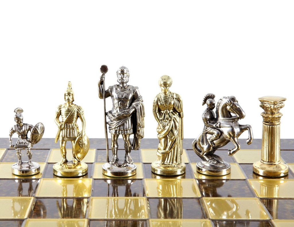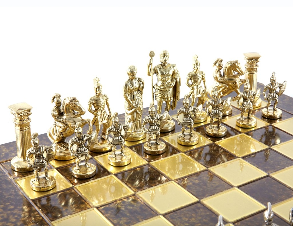 Our chessmen are made on a basis of an original zinc alloy, they are then gold or silver plated and finally varnished by hand. The chess boards are made of bronze and painted by hand. All the pieces are